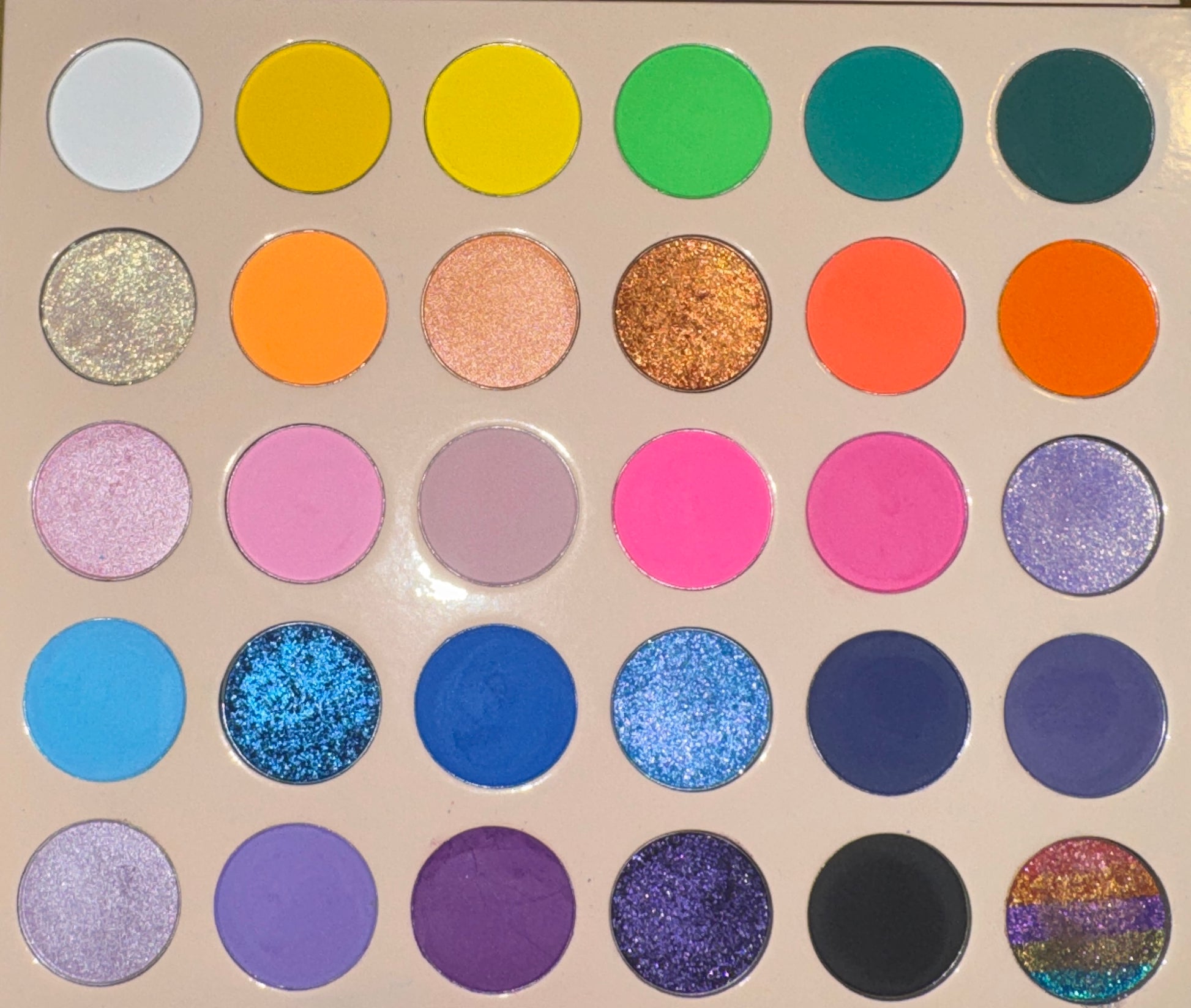 This palette delivers intense pigment, buttery mattes, and high shine shimmers that blend effortlessly and hit on every skin tone. From vibrant yellows, greens, blues, and purples to sultry pinks, corals, and deep smoky shades—every pan is curated to make a statement with minimal effort.